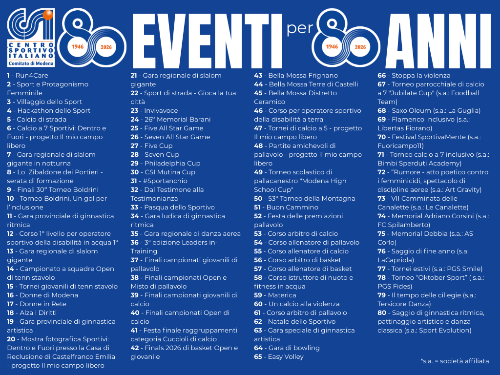 Il CSI di Modena guarda al futuro con responsabilità e fiducia, consapevole che lo sport può e deve essere uno spazio di inclusione, partecipazione, crescita e cittadinanza attiva. Gli 80 anni che celebriamo oggi sono il punto di forza da cui ripartire per le sfide di domani. I quattro grandi eventi del palinsesto interpreteranno simbolicamente i quattro elementi dell’essere umano: la Run4Care per il corpo, Sport: parità e protagonismo delle donne per la mente, il Villaggio dello Sport per il cuore e l’Hackathon per lo spirito. All’interno di questo programma saranno inseriti anche eventi organizzati direttamente da alcune delle società sportive nostre affiliate, perché il CSI da sempre sostiene e accompagna i propri associati nell’importante ruolo di presidio sociale prima ancora che sportivo. Un grande ringraziamento va a chi ha permesso al nostro Comitato di raggiungere 80 anni di storia e ai tanti partner che scelgono di sostenere gli appuntamenti di un 2026 che sarà davvero memorabile».