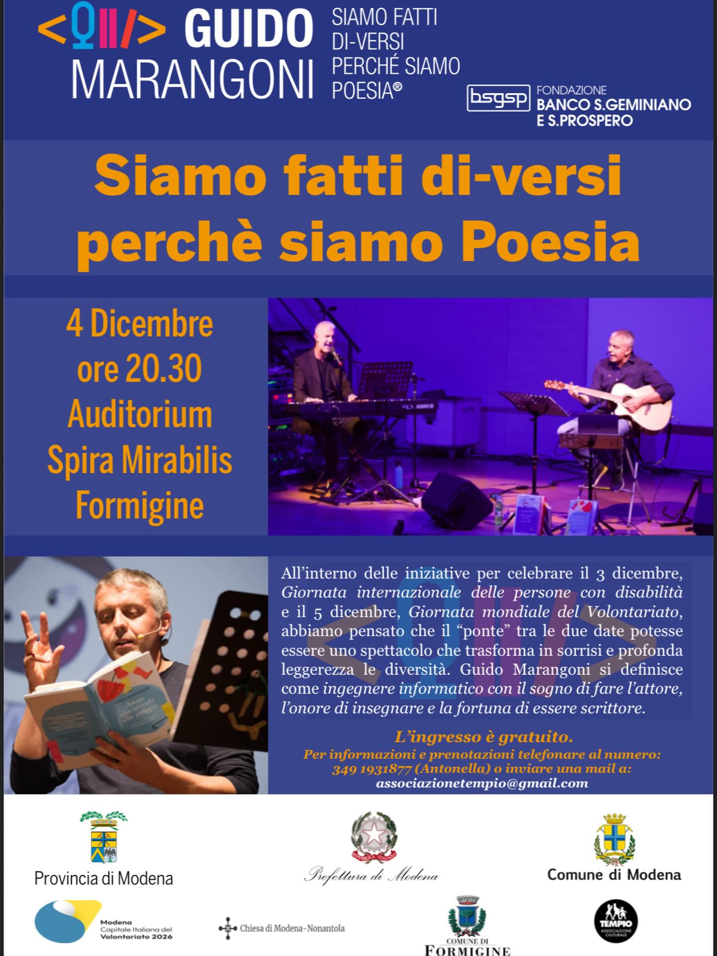 In occasione della Giornata internazionale delle persone con disabilità che si celebra il 3 dicembre e della Giornata mondiale del volontariato che si tiene il 5 dicembre, giovedì 4 dicembre alle ore 20.30 si svolgerà all’Auditorium Spira Mirabilis di Formigine lo spettacolo “Siamo fatti di-versi perché siamo poesia” di Guido Marangoni.