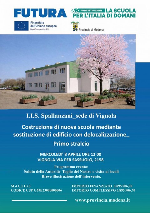 Mercoledì 8 aprile sarà inaugurata la nuova palazzina scolastica della sede di Vignola dell’istituto Spallanzani, per un importo complessivo di 3,9 milioni di euro, realizzato con fondi Pnrr che prevedono anche la demolizione della sede esistente dell’istituto.