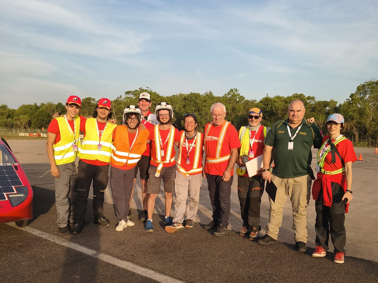 L’emozione è stata accompagnata da notevoli difficoltà logistiche: Emilia 5.9, consegnata per la spedizione il 9 giugno, ha subito una lunga serie di ritardi. Prevista inizialmente a Sydney per il 25 luglio, la data è stata più volte rinviata, finché il carico è arrivato in Australia. Dopo altri di 4 000 km via terra – 56 ore in un enorme road train con due autisti al volante senza sosta – l’auto ha raggiunto Darwin per gli scrutini e le prove statiche e dinamiche che permettono di ottenere la targa per circolazione su strada e poter partecipare alla competizione Solare più importante del mondo.