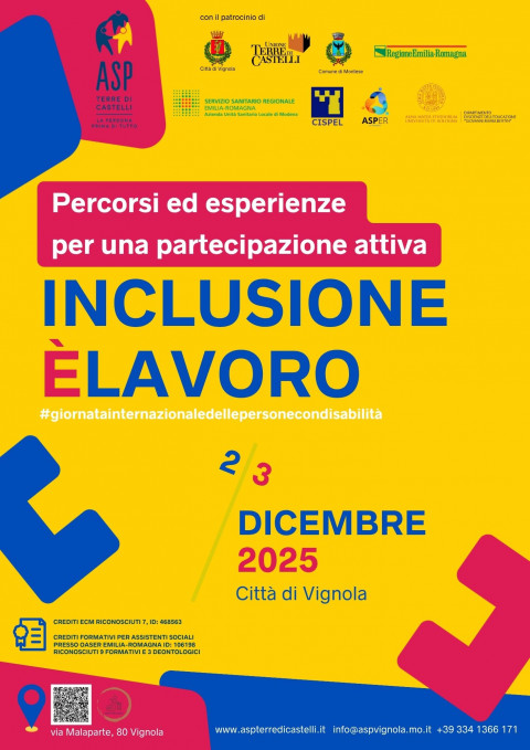 Prende il via, martedì 2 dicembre a Vignola, il convegno “Inclusione è lavoro: percorsi ed esperienze per una partecipazione attiva”, che esplora il tema strategico del lavoro e della disabilità cognitiva. Organizzato da ASP Terre di Castelli Gasparini ed articolato in due giornate, 2 e 3 dicembre, il convegno sulla disabilità è alla sua terza edizione, dopo che le prime due avevano esplorato i temi delle autonomie ed il rapporto tra sport e disabilità.