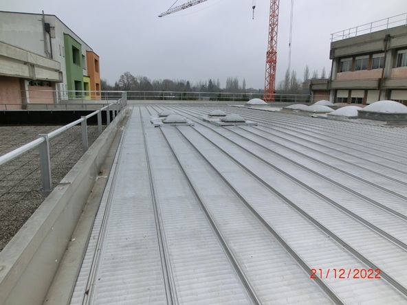 Il nuovo sistema impermeabile di copertura continua a doppio giunto drenante, privo di perforazioni, guarnizioni e sormonti trasversali, è costituito da lamiere metalliche in Alluminio.
