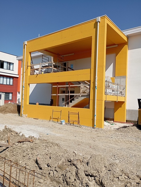 - Corpo 2: sul fronte sud del nuovo edificio è collocata una nuova scala di emergenza esterna in c.a. giuntata sismicamente dall’adiacente corpo scolastico.