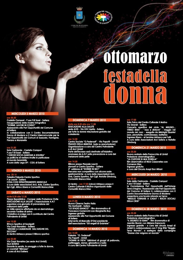 Anche quest’anno le istituzioni modenesi promuovono una serie di iniziative in occasione della festa dell’8 marzo. Si tratta di un importante momento per festeggiare le conquiste sociali, politiche ed economiche delle donne, per ricordare l’attualità della lotta per l’affermazione dei diritti di pari opportunità e per riproporre l’attenzione su alcuni dei principali problemi che investono le donne: la violenza e le relative strategie di contrasto, i diritti antidiscriminatori sanciti dalla Costituzione, il lavoro.