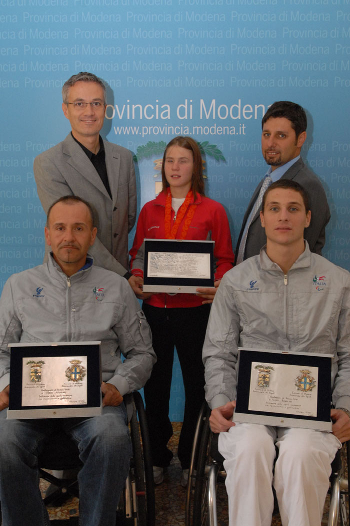«Ambasciatori dello sport modenese, rappresentanti nel mondo degli autentici valori ai quali si ispirano gli atleti». E’ il mandato affidato ai tre sportivi che hanno rappresentato Modena alle Paralimpiadi di Pechino e che sono stati ricevuti mercoledì 1 ottobre nella sede della Provincia dall’assessore provinciale allo Sport Stefano Vaccari e da Antonino Marino, assessore allo Sport del Comune di Modena.