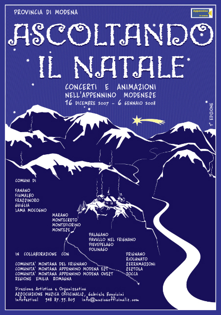 Le vacanze natalizie nei borghi dell’Appennino modenese sono arricchite quest’anno da spettacoli di vario genere, per tutti i gusti e per tutte le età. Si tratta di “Ascoltando il Natale“, una rassegna che comprende concerti, animazioni e spettacoli di strada, rappresentazioni sacre e altri eventi, in programma da domenica 16 dicembre 2007 a domenica 6 gennaio 2008.