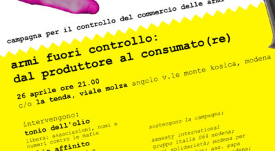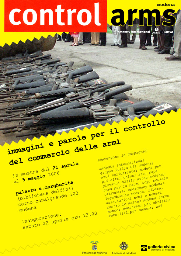 Immagini provenienti un po’ da tutto il mondo per dimostrare come la diffusione incontrollata di armi sia una minaccia per la vita e lo sviluppo delle popolazioni. E’ il tema della mostra “Control arms” che viene inaugurata sabato 22 aprile, alle 12, a Palazzo Santa Margherita a Modena (biblioteca Delfini, in corso Canalgrande 103). L’iniziativa fa parte della campagna promossa dalle associazioni Amnesty international, Iansa e Oxfam con l’obiettivo di istituire entro il 2006 il Trattato internazionale sul commercio degli armamenti. Alla campagna hanno aderito anche Provincia e Comune di Modena, oltre a diverse associazioni modenesi: da Lilliput a Libera, associazioni nomi e numeri contro le mafie; da Amnesty ad Arci solidarietà; da Casa per la pace a Emergency; fino a Modena per gli altri, Papa Giovanni XXIII, Attac Modena, Oltremare, Legambiente, Modena Terzo mondo, Overseas e Pax Christi.