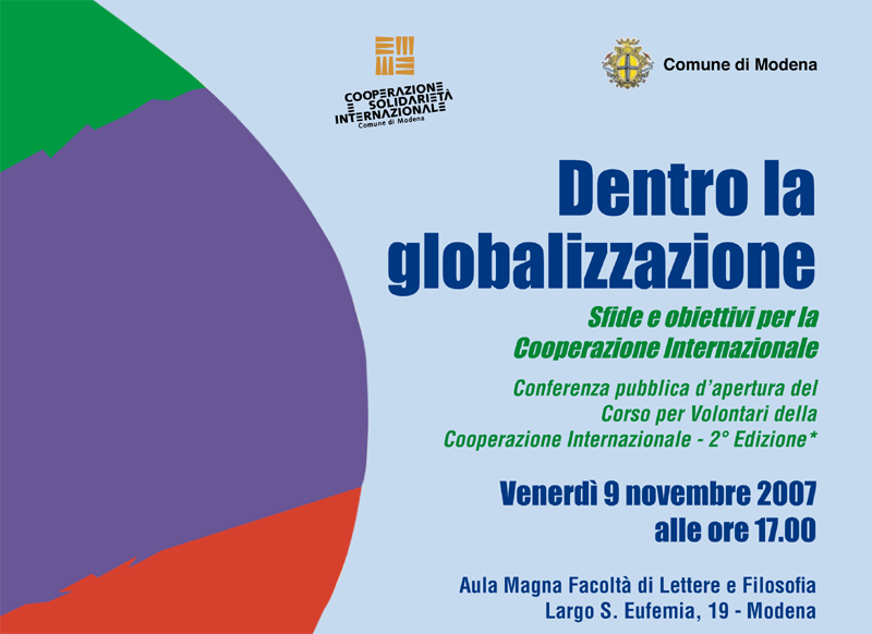 Venerdì 9 novembre con la conferenza “Dentro la Globalizzazione: obiettivi e sfide per la cooperazione internazionale” prende avvio il 2° del Corso per Volontari della Cooperazione Internazionale promosso dall’Ufficio Cooperazione e Solidarietà internazionale del Comune di Modena, in collaborazione con la Provincia di Modena, l’Università degli Studi di Modena e Reggio Emilia, il Centro Servizi per il Volontariato, l’ONG Overseas e le Associazioni locali del Tavolo per la Cooperazione.