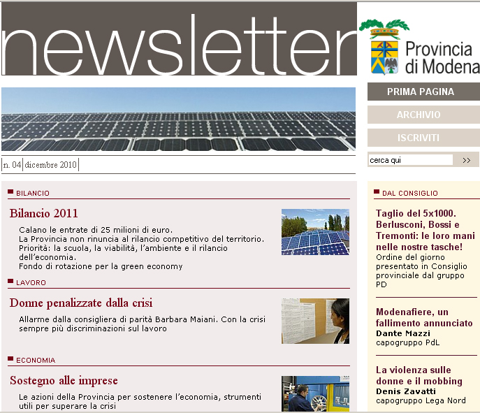 La Newsletter Provincia di Modena si può consultare on line o ricevere in posta elettronica iscrivendosi dal sito http://newsrivista.provincia.modena.it.