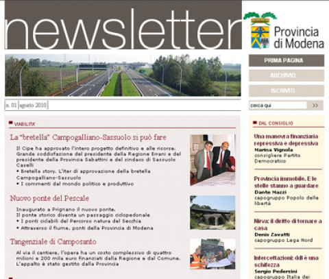 Le novità della Bretella Campogalliano-Sassuolo e il punto sulla situazione economica, passando per le opportunità offerte nel campo della formazione professionale e della situazione della scuola a un mese dalla prima campanella. Sono alcuni dei temi che affronta il primo numero della Newsletter Provincia di Modena, un nuovo strumento informativo che si può consultare on line o ricevere in posta elettronica iscrivendosi dal sito http://newsrivista.provincia.modena.it. Si può accedere anche dal portale www.provincia.modena.it.