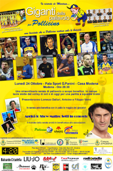Lunedì 24 ottobre alle 20.30 presso il Palasport Giuseppe Panini, in viale dello Sport 25 a Modena, è in programma una straordinaria serata di pallavolo a scopo benefico. In campo tante stelle del volley per una partita a squadre miste. Partecipano i giocatori e le giocatrici delle squadre modenesi Casa Modena e Liu Jo, che militano nelle serie A dei rispettivi campionati maschile e femminile, e altri campioni di ieri e di oggi come Fabio Vullo, Luca Cantagalli, Jan Held, Andrea Lucchetta, Marco Bertoli, Hristo Zlatanov, Andrea Gardini, Claudio Galli, Hugo Conte, Samuele Papi, Paolo Tofoli e Juan Carlos Cuminetti.