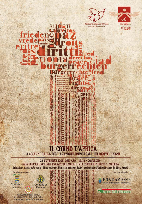 La manifestazione a favore della pace e dei diritti nel Corno d’Africa è promossa dalla Campagna Italiana per il Sudan, un coordinamento di associazioni e Ong italiane impegnate da anni per la pace e i diritti umani in Sudan, in collaborazione con la Provincia e il Comune di Modena, la Facoltà di Lettere e Filosofia dell’Università degli Studi di Modena e Reggio Emilia, con il contributo della Fondazione Cassa di Risparmio di Modena, e della Regione Emilia Romagna.