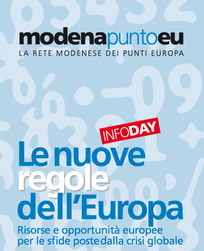 Mercoledì 9 dicembre alle ore 9.00 presso la Sala del consiglio Provinciale – Viale Martiri della Libertà 34 si terrà l’Infoday organizzato da ModenapuntoEU, la rete modenese dei punti Europa, sul tema “Le nuove regole dell’Europa” Risorse ed opportunità europee per le sfide poste dalla crisi globale.