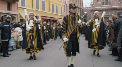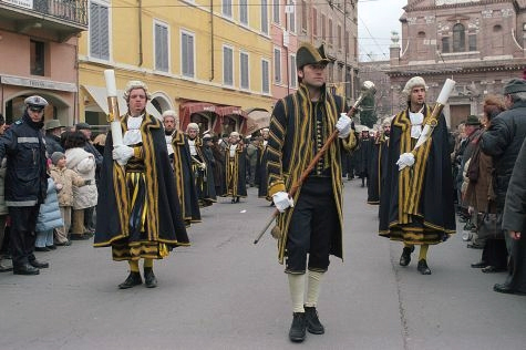 Nel corso della mattina si svolge anche il Corteo Storico che parte dal palazzo comunale intorno alle 10.20 e che rappresenta l’omaggio delle autorità civili cittadine alle autorità religiose e al patrono stesso. I Valletti comunali in livrea giallo blu vanno in processione dal Municipio verso il Duomo portando grandi ceri e indossando abiti e parrucche rinascimentali. L’antichissima tradizione ha visto spesso anche la partecipazione del Sindaco e degli Assessori, con l’obiettivo di portare in offerta i ceri e l’olio per la lampada che nella Cripta del Duomo arde perennemente davanti al sepolcro del patrono.