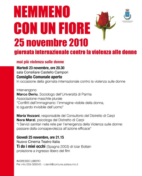 Quest’anno la Provincia di Modena ha adottato la campagna “Riconosci la violenza”, una campagna in Creative Commons per sensibilizzare le persone sul tema della violenza sulle donne e convocato un Consiglio provinciale del 24 novembre 2010 aperto alla cittadinanza dalle 15.00 alle 16.30 c/o la sede di Viale Martiri della Libertà 24 in cui sarà presentato il dossier delle azioni e iniziative realizzate dal Tavolo Tecnico violenza contro le donne, aggiornato all’anno 2010.